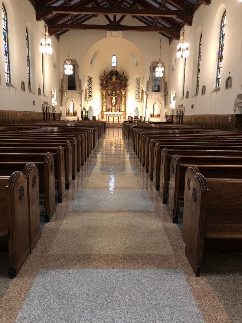 This is where the next symbol comes into play. As we walk further down the center aisle, we will come across another ancient Christian symbol. This one is of the mother pelican and her younglings. When she cannot find food, a mother pelican is known to bite off pieces of her own flesh and feed them to her young. Rather than see them starve, the mother pelican sacrifices herself to give them life. From the most ancient times, Christians came to see in the example of the mother pelican a symbol of the sacrifice of Jesus which we see dis- played front and center in the large crucifix in the center of the sanctuary just above the tabernacle.
